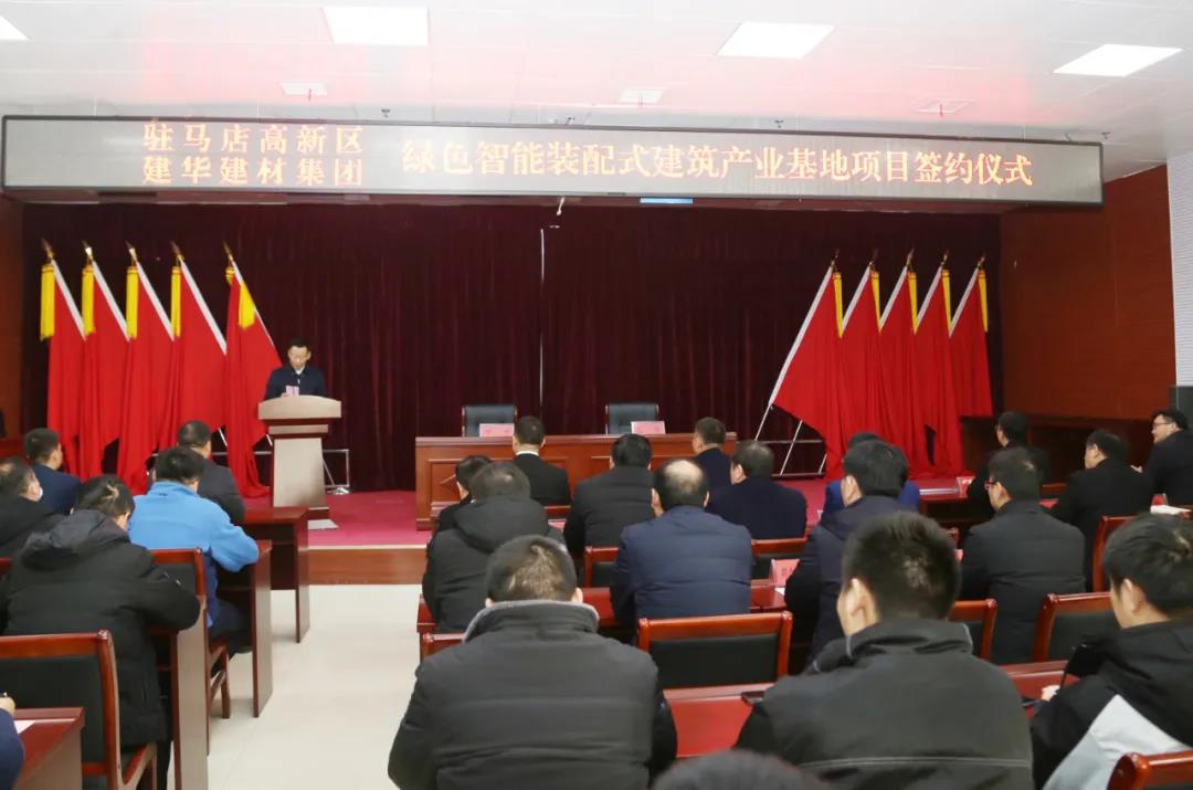 岁末添新彩。12月28日,建华建材集团与驻马店高新区管委会举行绿色智能装配式建筑产业基地项目签约仪式。驻马店高新区管委会党委书记、管委会主任李勇,党委副书记魏俊国,管委会副主任王勇卫,区纪工委书记晏国兵;建华建材集团总裁助理兼投资发展办公室主任汪峰,中原区域总经理刘勇,投资发展副总监杨元等领导出席了签约仪式。