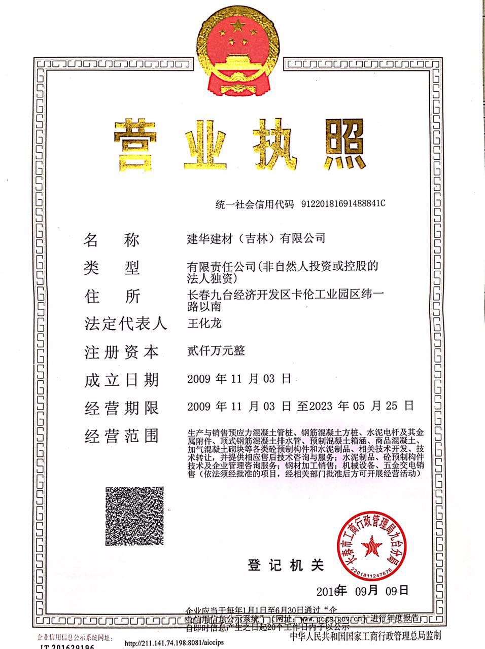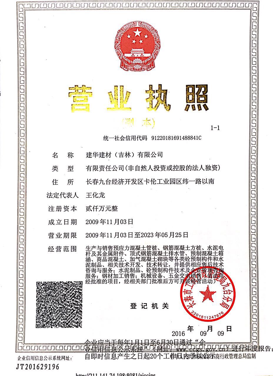一、企业简介 建华建材(吉林)有限公司于2009年11月成立,位于吉林省长春市九台经济开发区卡伦工业园区。目前除预应 力混凝土管桩外,还生产SC钢管桩,预制楼板等混凝土制品,具有三条生产线,年产450万米。 公司设有长春、吉延、松白3个管理区域,销售范围涵盖吉林省。公司成功运作很多优秀的项目,如新建吉 林至珲春铁路工程、新城吾悦广场、长春万达中心项目、四平阁等。