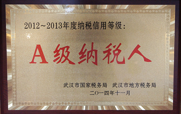 2014年获得武汉市2012-2013年度“A级纳税人”奖项