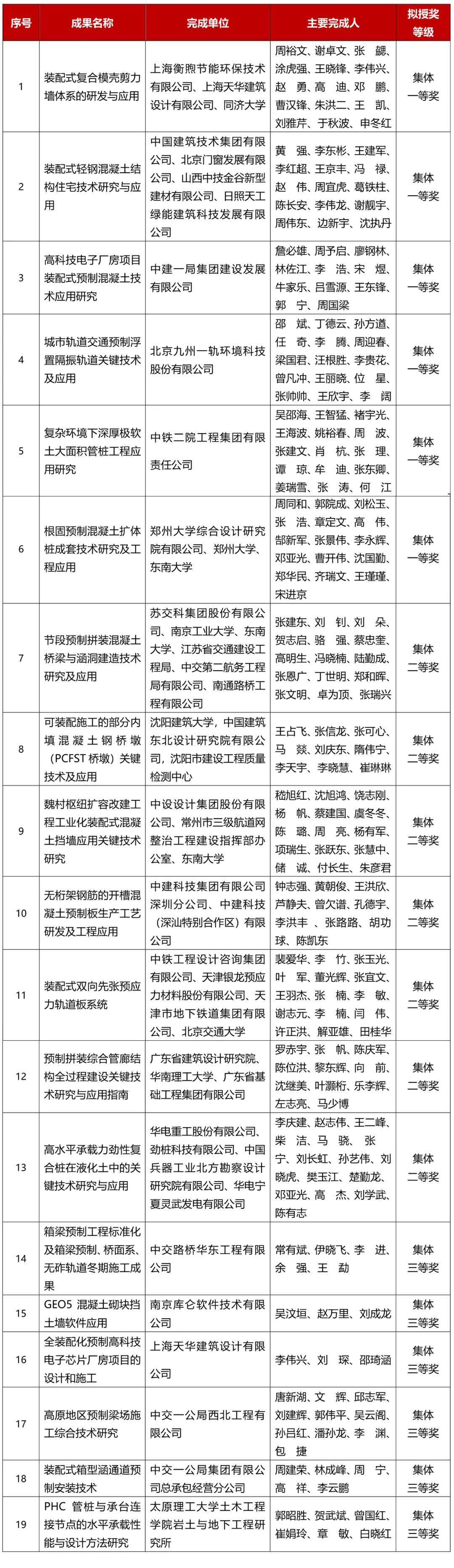 2021年度“建华工程奖”共收到有效申报材料68份,根据《“建华工程奖”章程》的要求,经过形式审查、预审、专家评审等程序,拟授予“装配式复合模壳剪力墙体系的研发与应用”等6项成果集体一等奖、“节段预制拼装混凝土桥梁与涵洞建造技术研究及应用”等7项成果集体二等奖、“箱梁预制工程标准化及箱梁预制、桥面系、无砟轨道冬期施工成果”等6项成果集体三等奖。为了确保“公开、公正、公平”的原则,现将拟授奖名单予以公示。如有异议,请在公示期内,书面向“建华工程奖”奖励办公室提出。以单位名义的,应写明单位、联系人、联系电话,并加盖单位公章;以个人名义的,应署本人真实姓名、工作单位和联系电话。
