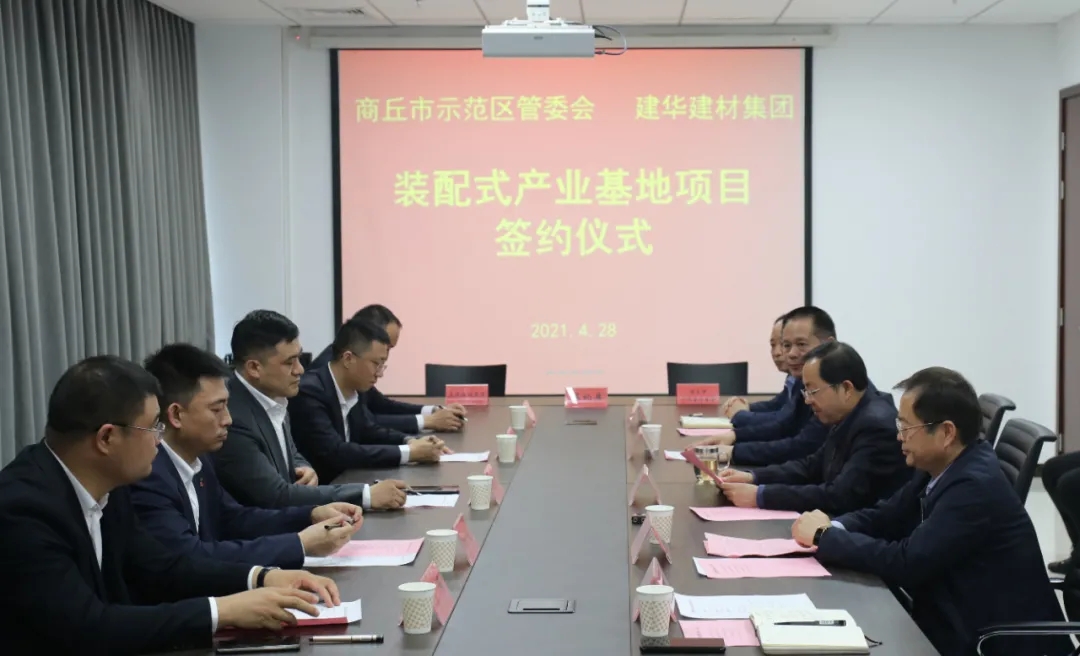 4月28日,建华建材集团与商丘市城乡一体化示范区管委会举行绿色智能装配式建筑产业基地项目签约仪式。商丘市人大常委会副主任、示范区党工委书记何振岭,示范区党工委副书记王俊峰,党工委委员、物流区管委会主任张留雁,党工委委员冯新以及区经发局、住建局等相关部门领导;建华建材集团总裁助理兼投资发展办主任汪峰,中原区域总经理刘勇,菏泽建华、徐州建华副总经理(全面负责)倪杰,投资发展办副总监杨元等领导出席了签约仪式。