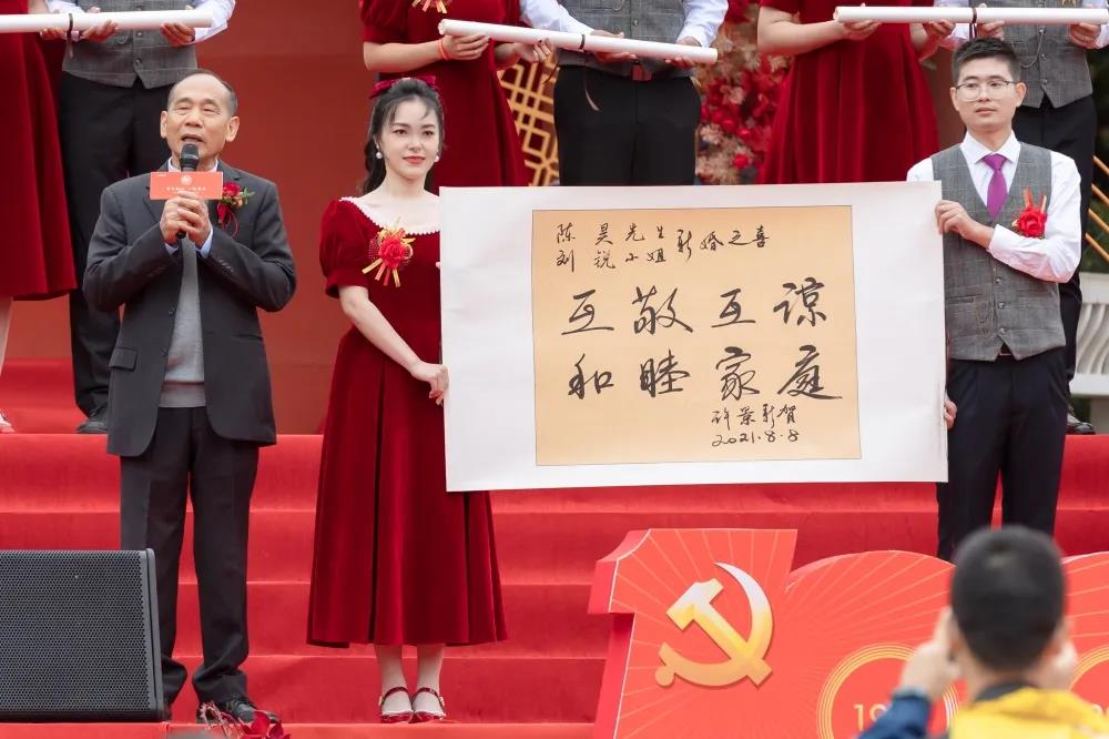 所有来宾挥舞国旗,齐声歌唱《没有共产党就没有新中国》,把现场的气氛推向高潮。伴着红心向党的告白,“百年初心,一‘榄’芳华”第十六届青年集体婚礼外场圆满礼成!
