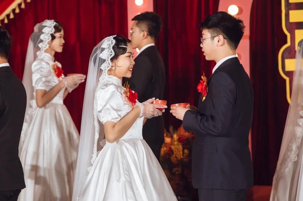 22对新人在鼓舞飞扬的开场舞中步入婚礼殿堂,幸福喜悦在每个人脸上洋溢。