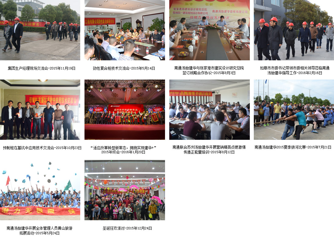 一、企业简介 南通汤始建华管桩有限公司于2010年5月成立于江苏省如皋市,公司目前共有4条生产线,产品主要有预应 力高强混凝土管桩、实心方桩、空心方桩、抗拔管桩、钢管桩、劲性体、无端板桩、支护桩、预制桥墩、预制楼 梯、预制墙板、U型渠、仿木桩、仿木护栏等混凝土预制构件,年生产能力达700多万米。 公司在南通、张家港、东台、大丰、泰州等区域共设有8个销售网点,其产品广泛用于住宅、商业和工业房 地产,以及公路、铁路、电力、水利等交通基建设施和政府大楼、医院、学校、展览中心和水务项目等公共设施 的建设。