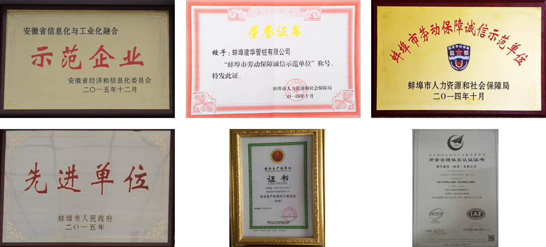 一、企业简介 建华建材(蚌埠)有限公司于2010年11月成立,位于安徽省蚌埠市禹会区马城镇。公司目前已建有2条管桩生 产线。主要从事生产预应力混凝土管桩、钢筋混凝土方桩、钢管桩以及其他砼预制构件和混凝土产品,实现400万 米/年生产能力。 目前公司产品已覆盖皖北各地市(蚌埠市、淮南市、阜阳市、宿州市、滁州市、淮北市、亳州市),并配备专 业工程师为每一个采用建华管桩进行施工的工程进行产品跟踪、技术咨询等各项售后服务。近年来,产品已成功应 用于郑徐高铁萧县路段、阜阳万达广场、蚌埠市肿瘤医院、宿州体育馆、砀山第二中学等项目。